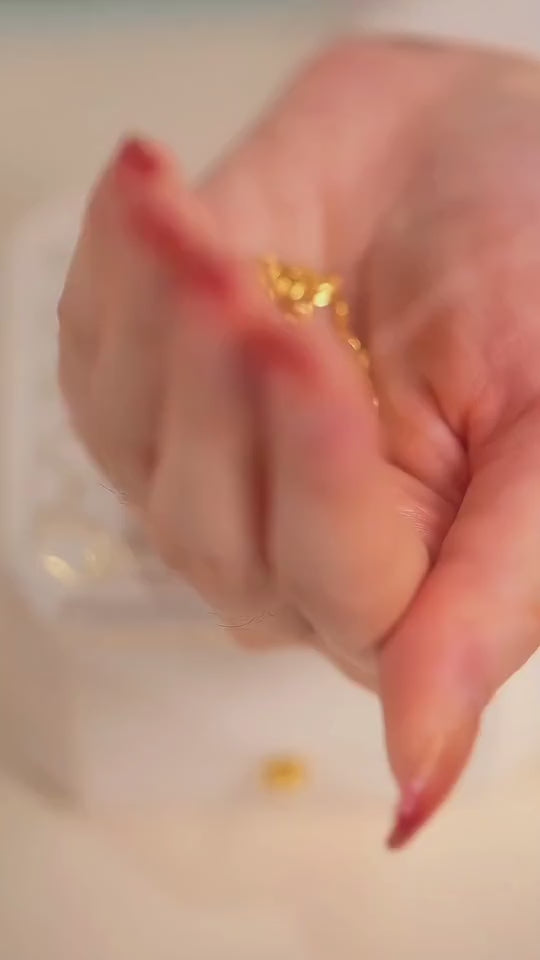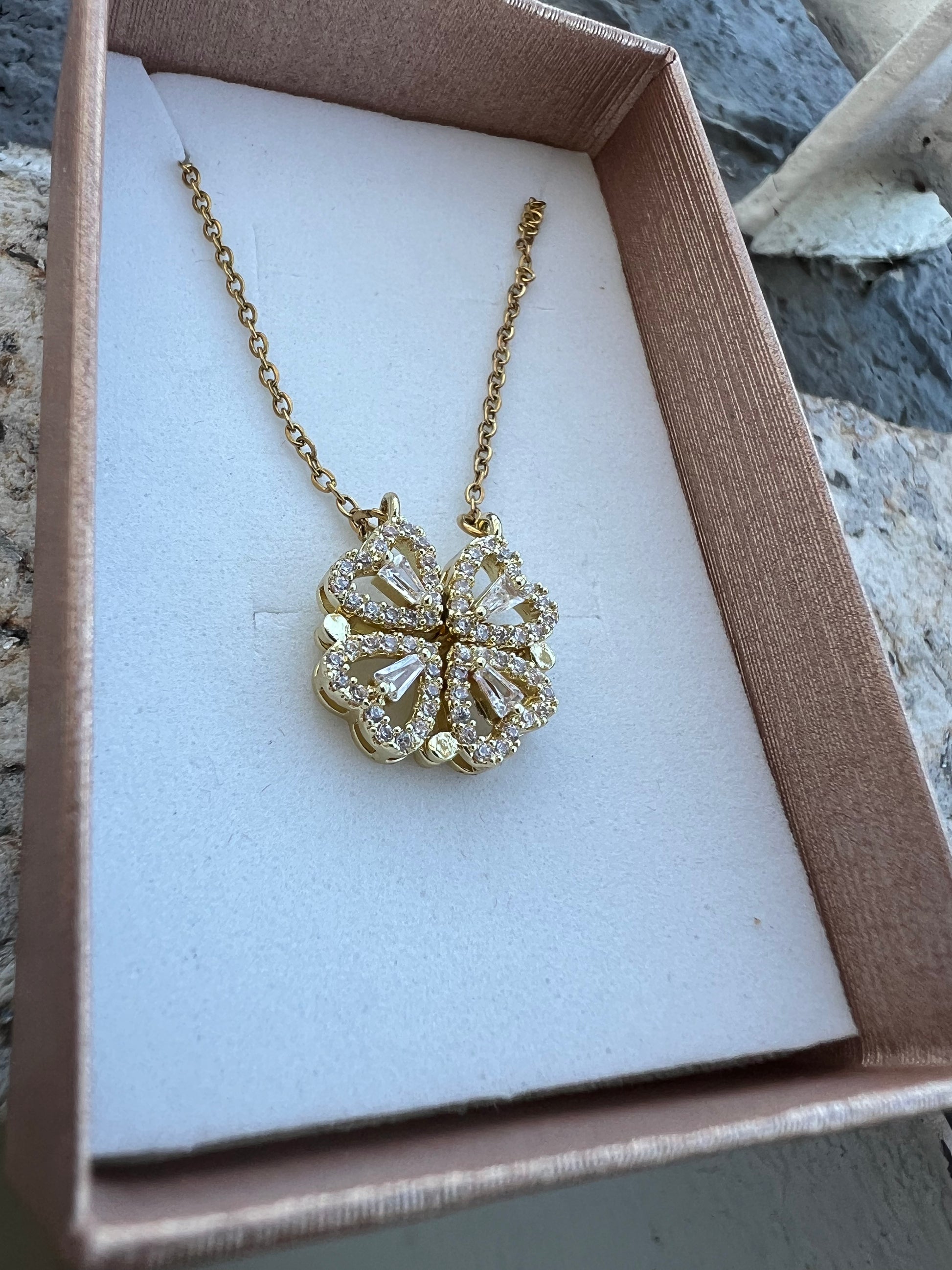 Collar elaborado en acero inoxidable con dije de cobre galvanizado. La cadena mide 40 cm con una extensión de 5 cm. El dije tiene una longitud de 3 cm cuando está extendido y 1.5 cm cerrado, mientras que los corazones miden 0.8 cm.